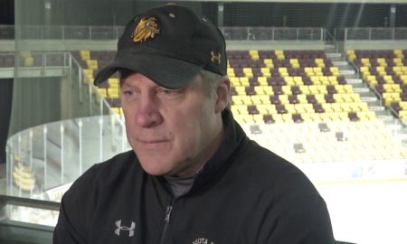 UMD Males’s Hockey head coach Scott Sandelin speaks with the media on April three, 2019 at his weekly press convention.